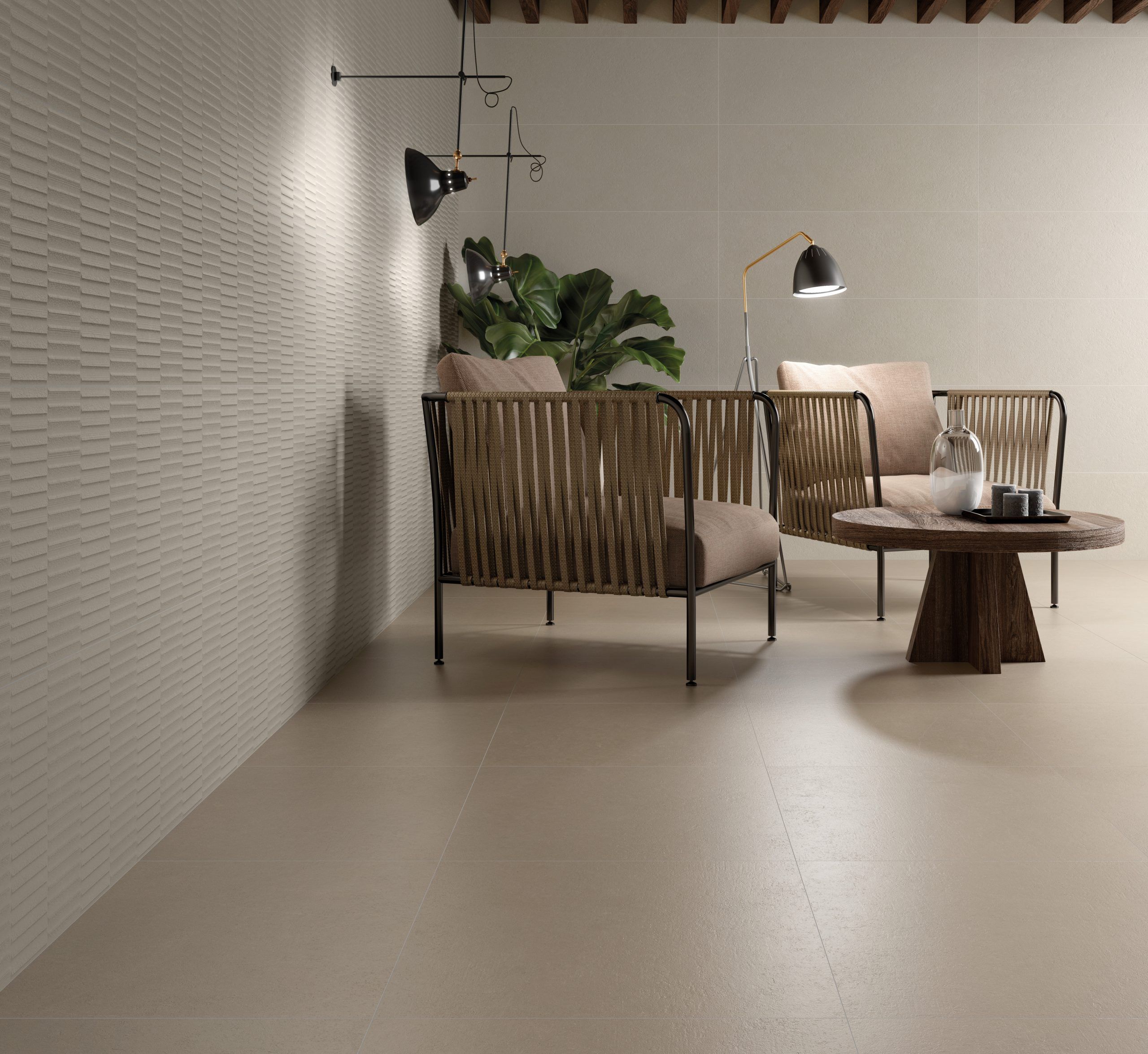 Materiales reinterpretados para adaptarlos a las nuevas tendencias. Juegos de texturas, acabados y relieves que aportan un valor añadido. Colores naturales y tranquilos capaces de encajar en cualquier ambiente.